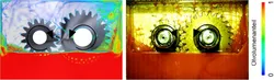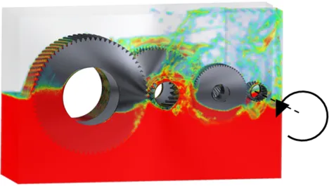 Einhergehend wurde festgestellt, dass insbesondere die Umfangsgeschwindigkeit, die Drehrichtung und die Schmierstoffviskosität das Verlustmoment beeinflussen. In Abb. 2 ist exemplarisch die simulierte Ölverteilung eines Praxisgetriebes dargestellt. Im weiterführenden Projekt FVA 857 II wird das Potential der Smoothed Particle Hydrodyanamics (SPH) Methode zur Getriebeölströmungssimulation von Praxisgetrieben untersucht. In künftigen Projekten kann können thermische CFD-Simulationen zur Untersuchung des Wärmehaushalts von Getrieben untersucht werden.