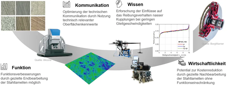 Nasslaufende Lamellenkupplungen bilden in modernen Antriebssystemen wichtige Baugruppen und haben sowohl komfort- wie auch sicherheitsrelevante Aufgaben für den Antriebsstrang. Von zentraler Bedeutung für die Funktion einer nasslaufenden Lamellenkupplung ist das zugrundeliegende tribologische System, bestehend aus Reibpaarung, Schmierstoff und Beanspruchung. Durch die Wahl eines spezifischen tribologischen Systems wird das Reibungsverhalten maßgeblich beeinflusst. Komfort und Sicherheit der Kupplung können insbesondere durch das Reibungsverhalten bei niedrigen Gleitgeschwindigkeiten, im sog. Langsamlaufschlupf, charakterisiert werden. Für eine gute Regelbarkeit der Kupplung ist hierbei ein ansteigendes Verhalten der Reibungszahl über der Gleitgeschwindigkeit von zentralem Interesse. Zudem ist insbesondere auch die Bestimmung der Haftreibungszahl von Bedeutung. Bisherige Untersuchungen fokussieren sich dabei meist auf die Einflüsse von Reibbelag, Schmierstoff und Beanspruchungen auf das Reibungsverhalten. In den Vorhaben FVA 343/III und /IV wurden die Einflüsse der Stahllamellenbeschaffenheit auf das Einlaufverhalten untersucht. Neben signifikanten Einflüssen der Stahllamellenbeschaffenheit auf das Einlaufverhalten zeigten sich auch deutliche Einflüsse auf das Reibungsverhalten der eingelaufenen Kupplung. Aktuell liegen keine übertragbaren, systematischen Erkenntnisse zu Einflüssen der Stahllamellenbeschaffenheit auf das Reibungsverhalten eingelaufener Kupplungen in Langsamlauf- und Mikroschlupf vor. Im Rahmen des Vorhabens sollen anhand von experimentellen Untersuchungen die Einflüsse der Stahllamellenbeschaffenheit auf das Reibungsverhalten in Langsamlaufschlupf und Mikroschlupf identifiziert und anhand von flächenhaften Oberflächenkennwerten mit charakterisierenden Reibungszahlkennwerten korreliert werden. Eine derartige Korrelation ermöglicht eine gezielte Optimierung der Fertigungsparameter und Endbearbeitungsschritte in der Stahllamellenherstellung mit den Zielen Kostenreduktion in der Fertigung und Erhöhung der Leistungsfähigkeit der Kupplung.