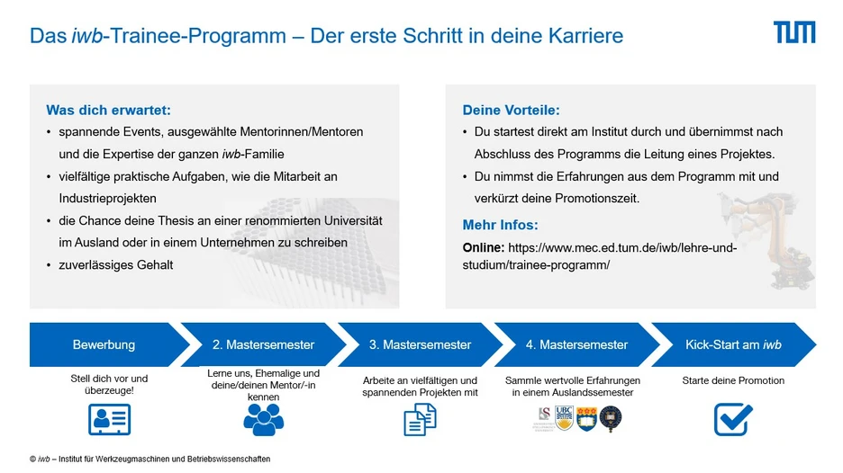 Während Deiner gesamten Zeit als iwb Trainee steht Dir ein/e persönliche/r Mentor/Mentorin als Ansprechpartner zur Verfügung. Bei einer erfolgreichen Beendigung des Programms profitierst Du von einer direkten Übernahme an das iwb. Aufgrund der gezielten Vorbereitung durch das Trainee-Programm lässt sich die darauf folgende Promotionszeit verkürzen.