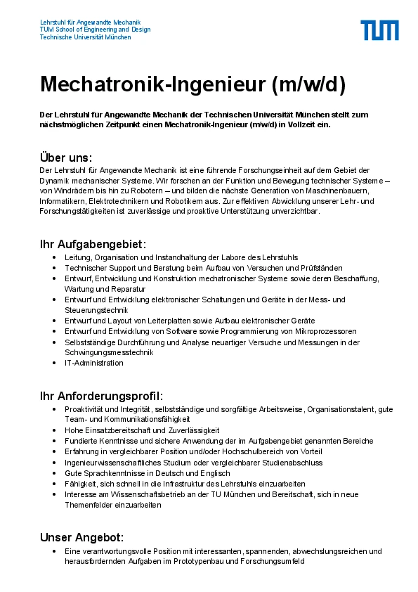 Der Lehrstuhl für Angewandte Mechanik der Technischen Universität München stellt zum nächstmöglichen Zeitpunkt einen Mechatronik-Ingenieur (m/w/d) in Vollzeit ein.