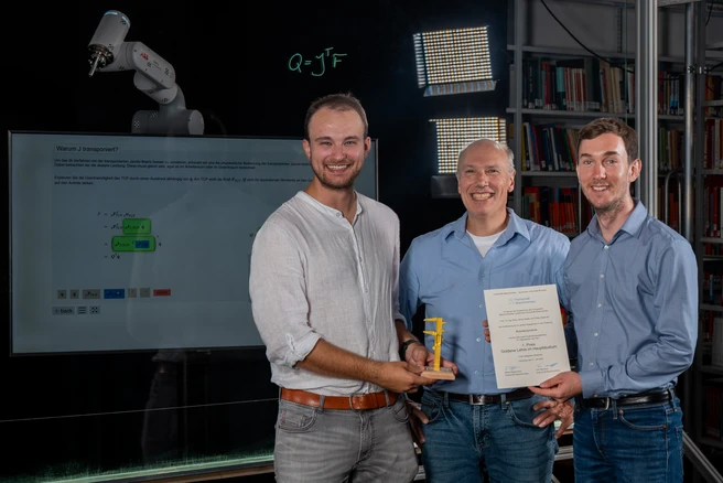 We, Prof. Daniel Rixen, Philipp Radecker, and Moritz Sattler, are happy to share that we won first place in the teaching award Goldene Lehre in the category “Lectures in Advanced Studies” for Robot Dynamics. Our teaching concept, Room for Improvement, is very well accepted by the students. Students are individually learning at their own pace in our learning platform with interactive mathematical exercises. By doing this in person at the university, students can discuss their questions with each other, and we can engage with them as tutors. Experiments and interaction with real hardware arise naturally in this context.