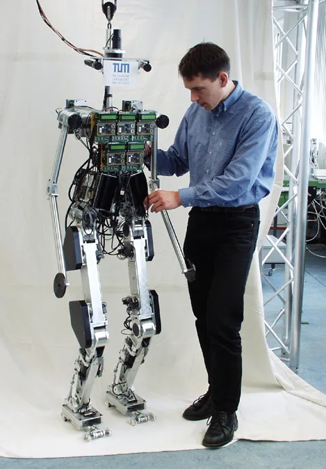 People have been fascinated by walking machines for a long time. A growing number of research groups is addressing the problem of realizing biped robots. Large advances in the development of actuators, sensors and particularly computers allow for the realization of more and more sophisticated walking robots. Within the framework of the DFG “Priority Program Autonomous Walking”, the JOHNNIE-project developed and build an autonomous biped walking robot. The main objective was to realize an anthropomorphic walking machine with a human-like, dynamically stable gait. The robot is able to walk on even and uneven ground and around curves. Further, a jogging motion is planed, which is characterized by short ballistic phases where both feet are not in contact with the ground. The robot is autonomous in terms of actuators, sensors and computational power, while the energy is supplied by a cable.