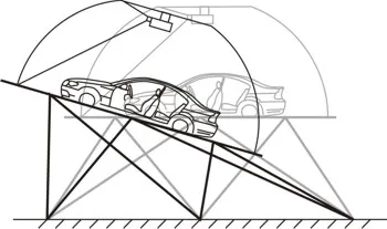 To generate the movements, especially the accelerations of the simulated vehicle, a motion platform is necessary. Usually Stewart-Gough Platforms are being employed for flight as well as for driving simulators. These parallel robots are assembled of six electromagnetic or hydraulic linear actuators, which connect the ground with an upper platform. The advantage of such a system is its ability to conduct movements in all six degrees of freedom (3 translational dof, 3 rotational dof). Mounted on the upper platform is the replication of a car interior, the mock-up. The passenger, sitting inside the mock-up, steers the simulated vehicle like in a normal car by the steering wheel, break and acceleration pedal.