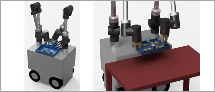 The aim of the project is to expand the range of tasks performed by AGVs to include complex handling and pre-assembly processes. In order to increase efficiency in real applications, these processes should also be able to be performed while the vehicle is in motion. To achieve this goal, a mobile robot with two collaborative manipulators is being developed, which combines transport with the manipulation of objects and thus adds value. In particular, this can also eliminate tasks currently performed manually on mobile platforms and, in turn, enable stationary work for humans even in flexible production processes. For robust and efficient operation, an AI-based control system is designed that can react flexibly to load peaks and errors, as well as incorporate previous experience into future decision-making.