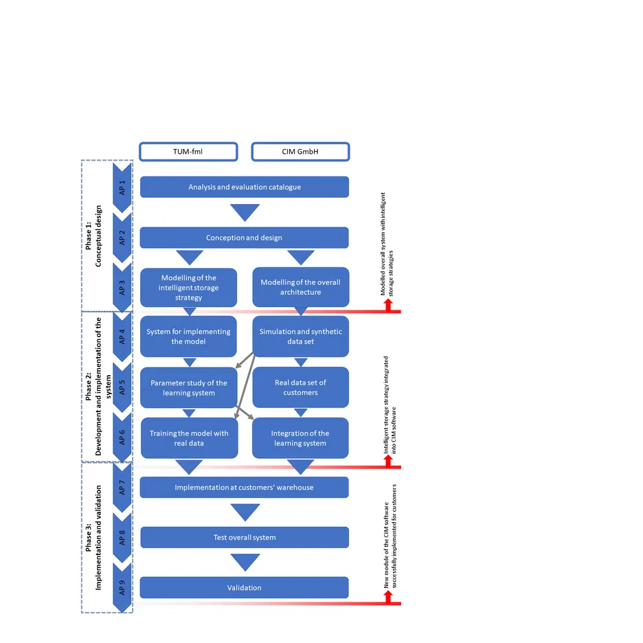 First, analysis and evaluation of methodologies and algorithms as well as design of the intelligent storage strategies take place (Working Packages 1 & 2). Subsequently, the intelligent storage strategies are developed (WP3) and a machine learning model for these strategies is implemented (WP4). Afterwards, on the basis of a parameter study on synthetic data, the hyperparameters of the machine learning model are optimized (WP5). At this stage, the model is prepared to be trained on realistic data (WP6). After completion of the training, the artificial intelligence module is implemented in the warehouse management software of the company CIM GmbH at the warehouse of a customer of the company (WP7). Finally, the whole software is tested (WP8) and validated (WP9).