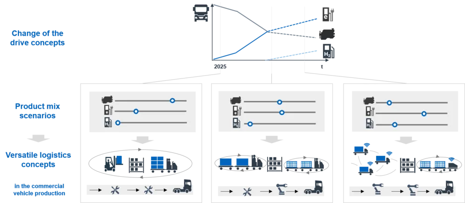 The objective of this research project is the development, evaluation and selection of flexible, adaptable logistics concepts for the integration of alternative drives in commercial vehicle production.