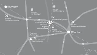 On motorway (A96) to exit 'Landsberg am Lech-West', B17 direction to 'Landsberg am Lech-West/Augsburg' to exit 'Haunstetten-Nord', right onto street 'Bürgermeister-Ulrich-Straße' and after approx. 300 m turn into street 'Am Technologiezentrum'.