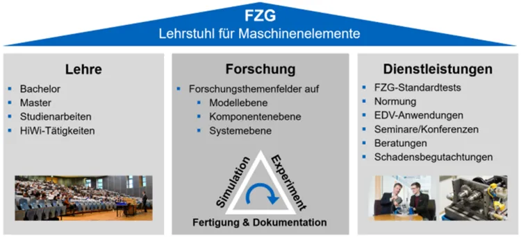 Zu den Hauptarbeitsgebieten des Lehrstuhls zählt die systematische Erforschung der Tragfähigkeit von Zahnradgetrieben. Als weitere Schwerpunkte haben sich Anwendungen in der Automobiltechnik entwickelt, wie Synchronisierungen, Lamellenkupplungen und Wälzlager. Dabei steht die Betrachtung von Lebensdauer, Wirkungsgrad, Reibungs- und Schwingungsverhalten von Getrieben bzw. von Getriebeelementen im Vordergrund der Forschungstätigkeiten an der FZG. Einen Überblick über die zentralen Themen der FZG im Bereich Forschung, Lehre und Dienstleistung gibt die untere Abbildung.