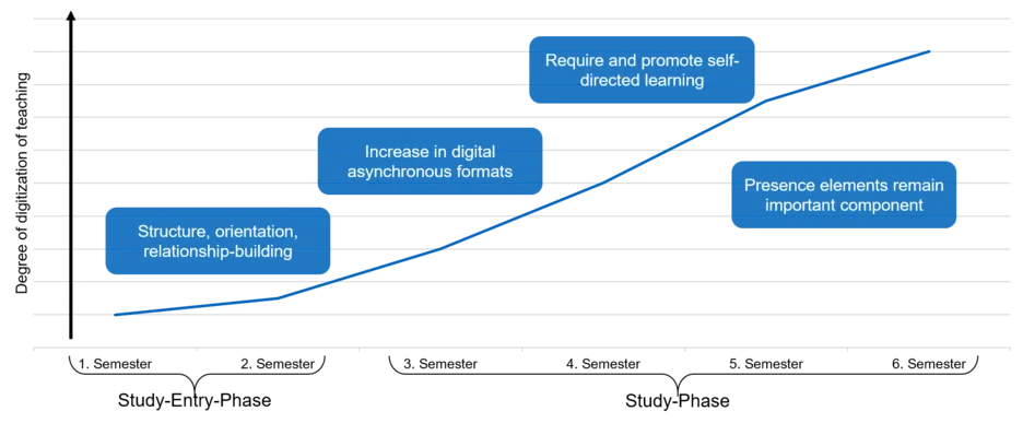 The project "Competence- and Requirement-Optimized Teaching Strategy" is supposed to provide a criterion-based guideline for analog, digital, and synchronous or asynchronous teaching approaches and formats for the study-entry- and study-phase. The strategy aligns the degree of digitization of the teaching approach with the needs and the intended competencies of the students. The respective advantages of the teaching approaches and formats are to be used in the best possible way in the different phases of the studies. At the beginning, students are guided into their new stage of life by a high degree of face-to-face courses and progressively led to digital, asynchronous formats. Digital offerings should assist selectively and be used primarily when the intended competencies require, for example, the use of software. In the further progression, the degree of digital asynchronous formats will increase in order to demand and promote self-directed learning of the students. Figure 1 schematically shows the degree of digitization of the teaching approach over the study term and assigns key areas of the concept to the different phases, the Study-Entry-Phase and the Study-Phase.