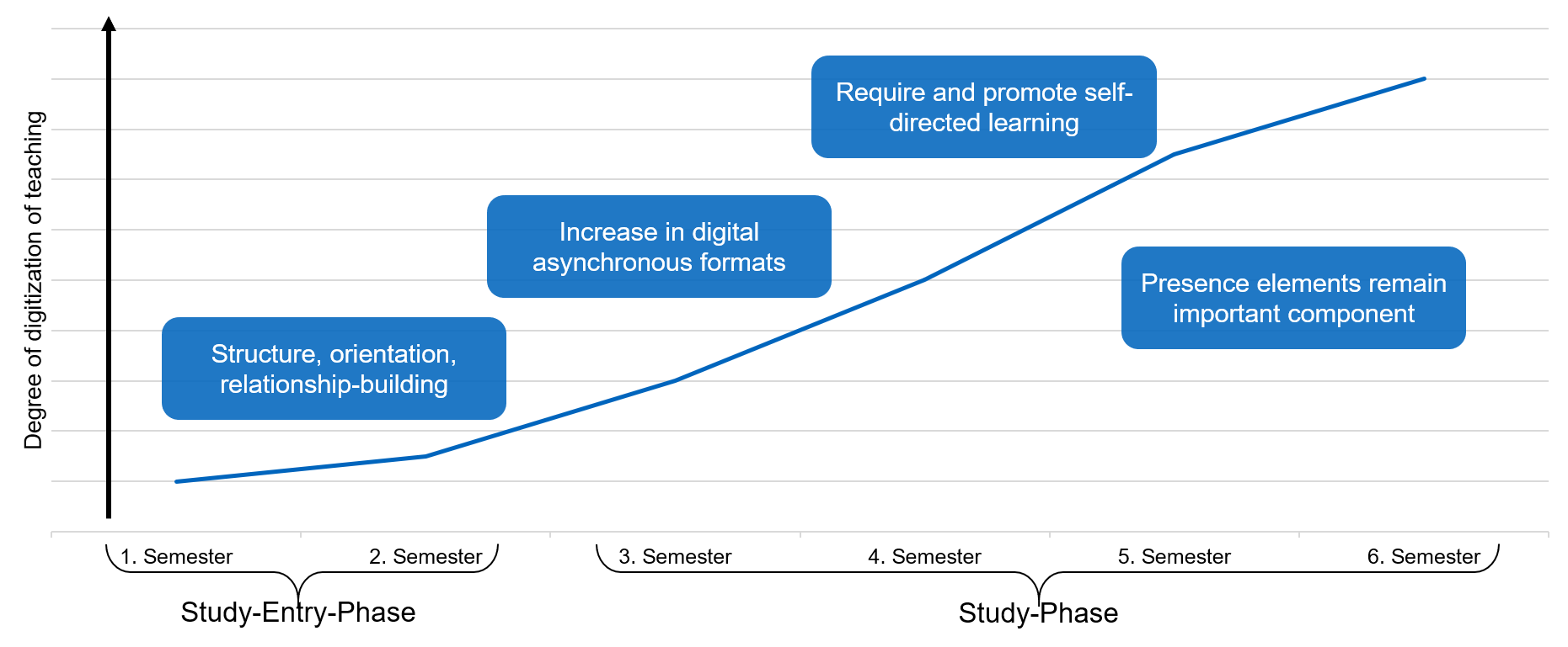 The project "Competence- and Requirement-Optimized Teaching Strategy" is supposed to provide a criterion-based guideline for analog, digital, and synchronous or asynchronous teaching approaches and formats for the study-entry- and study-phase. The strategy aligns the degree of digitization of the teaching approach with the needs and the intended competencies of the students. The respective advantages of the teaching approaches and formats are to be used in the best possible way in the different phases of the studies. At the beginning, students are guided into their new stage of life by a high degree of face-to-face courses and progressively led to digital, asynchronous formats. Digital offerings should assist selectively and be used primarily when the intended competencies require, for example, the use of software. In the further progression, the degree of digital asynchronous formats will increase in order to demand and promote self-directed learning of the students. Figure 1 schematically shows the degree of digitization of the teaching approach over the study term and assigns key areas of the concept to the different phases, the Study-Entry-Phase and the Study-Phase.