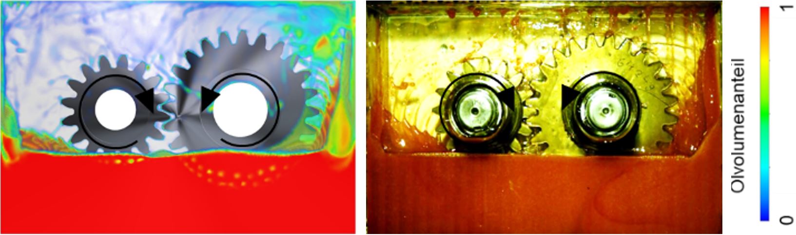 The objective of the research project FVA 857 I "Transmission Oil Flow Simulation" was the development and validation of a simulation methodology for CFD simulation of oil flow and no-load gear power loss in dip-lubricated transmissions and the derivation of a best practice guideline for gearbox oil flow simulation. With the developed simulation methodology, the influence of oil-specific and geometric parameters on oil distribution could be investigated, as exemplified in Figure 1. The simulation results were also used to develop a basic understanding of the interaction of gears with oil and air, where pressure and shear forces were found to be particularly relevant. The oil distribution was found to have a significant influence on the no-load gear power loss. It was also found that the circumferential speed, the direction of rotation and the lubricant viscosity in particular influence the loss torque. Figure 2 shows an example of the simulated oil distribution of a practical gearbox.