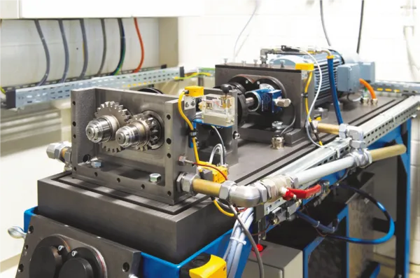 In this test rig concept, the test pinion and test wheel are fixed on two parallel shafts connected with the slave gear with the same transmission ratio. The decisive advantage of this bracing principle is that only relatively small powers of the drive machine are required, even for high test powers.