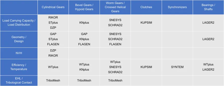 The program Pinion Modification RIKOR allows the calculation of shaft deformation, bearing deflection, tooth flank corrections, load distribution in tooth contact, damage-relevant stresses, and contact pattern for spur, helical, and double helical gears.