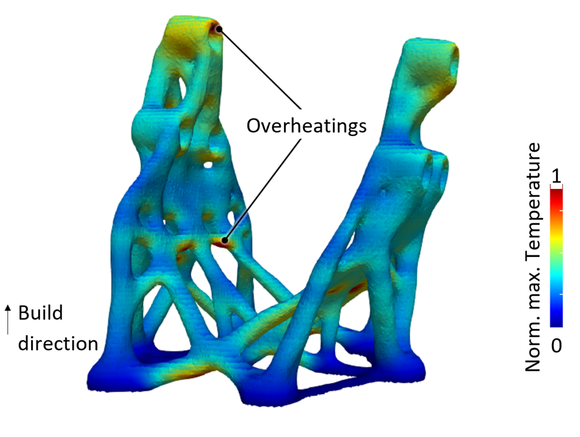The overall aim of the research project is to promote material- and energy-efficient lightweight construction through AM. To this end, the build-up process is simulated at the iwb to detect overheatings in the parts. Subsequently, the critical areas in the part are identified from the simulation results. These areas are adapted in the topology optimization to increase the process stability in AM.