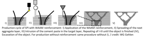 Within the scope of the joint research project with the Chair of Materials Science and Testing (TUM) and the Institute of Particle Technology (TUBS), the combination of two additive manufacturing processes for the production of concrete components with integrated reinforcement is being investigated. Wire and Arc Additive Manufacturing (WAAM) is used as an Additive Manufacturing process based on an arc welding technique. WAAM is combined with Selective Cement Paste Intrusion (SPI). The SPI process is a particle-bed-based additive manufacturing technology, in which aggregate is applied in thin layers and locally bound with cement paste.
