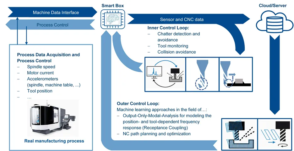 An edge computer (smart box) acquires machine data via network communication and executes a two-stage control loop (see figure above). The internal control loop performs the time-critical tasks of chatter detection and avoidance, collision monitoring and tool wear monitoring. In the outer control loop, NC-codes are optimized with regard to the position- and tool-dependent receptance (no dynamic instabilities, minor form errors, and low machining forces). As a result, the control loop does not only increase manufacturing accuracy but also enables a longer tool and machine life. The decisive challenge of this research project is to acquire high-frequency machine data without extensive additional sensors. In addition, it is necessary to enable process-parallel monitoring and control of the machining process through efficient identification and mathematical description of the system dynamics.