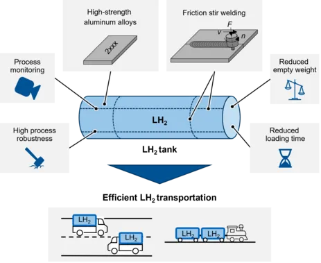 The project aims to enable the production of lightweight tanks for the liquid hydrogen (LH2) transportation. The lightweight design is possible by using high-strength aluminum alloys as well as friction stir welding (FSW), which is a highly reproducible and robust process. The reduced weight of the tank allows novel, but heavy equipment to be transported for faster refueling as well as higher amounts of LH2, which both enhances the efficiency of the LH2 distribution.