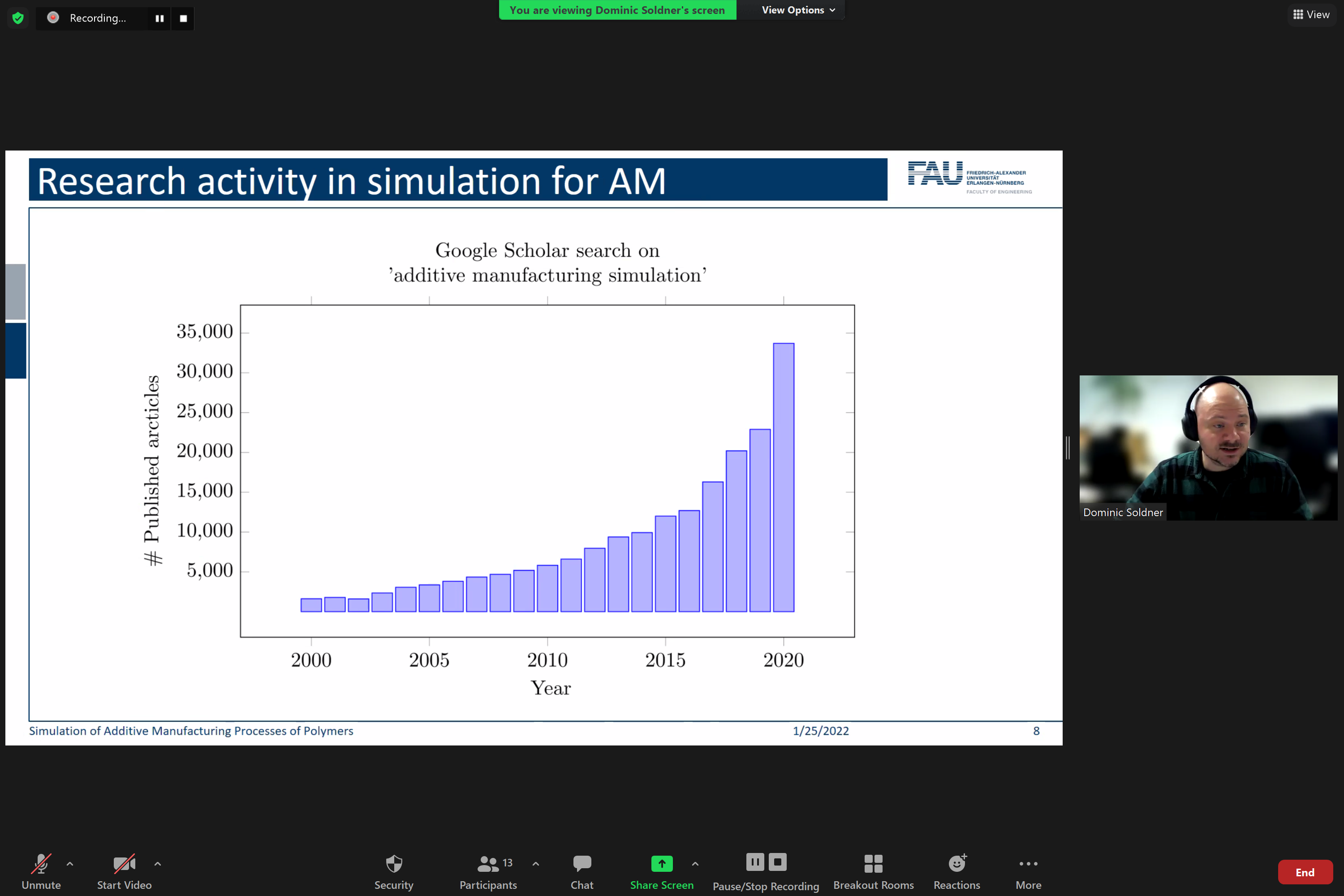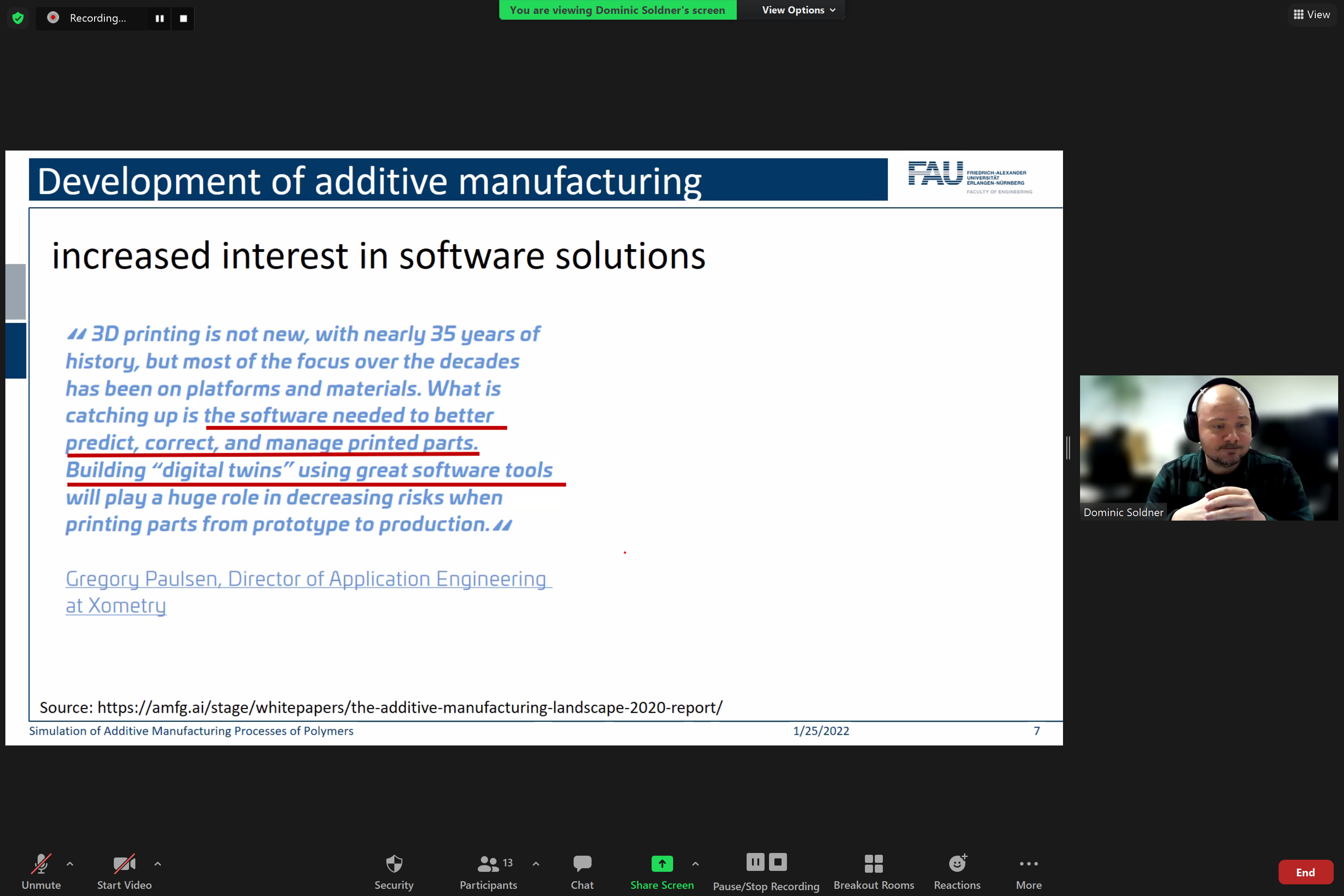 On January 25, 2022, we were pleased to welcome Mr. Dominic Soldner as a guest speaker in our lecture series Additive Manufacturing with Plastics. Mr. Soldner is a researcher at the institute of applied mechanics at the Friedrich-Alexander University in Erlangen. As an expert in the field of simulation of additive manufacturing processes of polymers, he was able to give students an insight into this subject area.