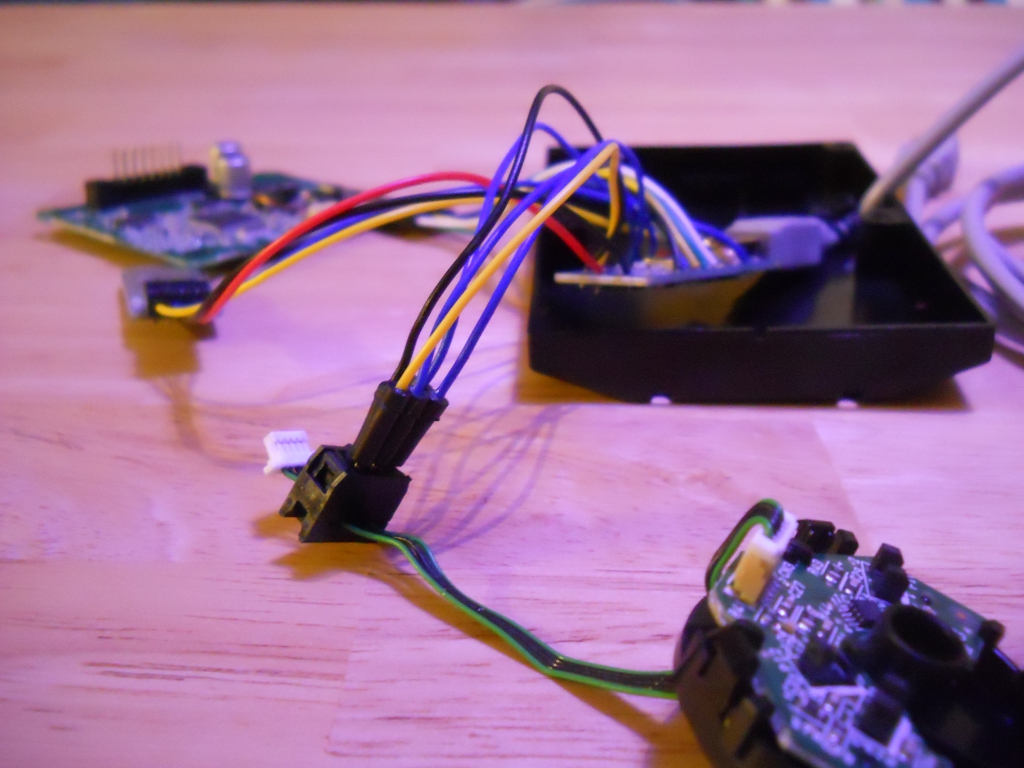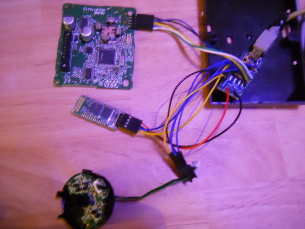 The knob was opened. There are two circuit boards inside. The smaller (upper) board and the larger (lower) board. The upper board has three light barriers/sensors. Two light barriers sense the rotary motion, like in old mechanical mouses (phase shifted A, B signal). The third light barrier is interrupted, when someone pushes on top of the knob. The connector between the boards was disconnected and the wires were tapped to the Arduino. The power for the upper boards is also provided from the Arduino Nano (5V). On the lower boards are four mechanical switches for the 4-way navigation (joystick). These were disconnected from the circuit (scratching) and routed with thin wires to a new connector, which was glued with expoxy to the board. From there connected to some Arduino Nano active low inputs, so we need five wires (buttons connect to GND when closed).