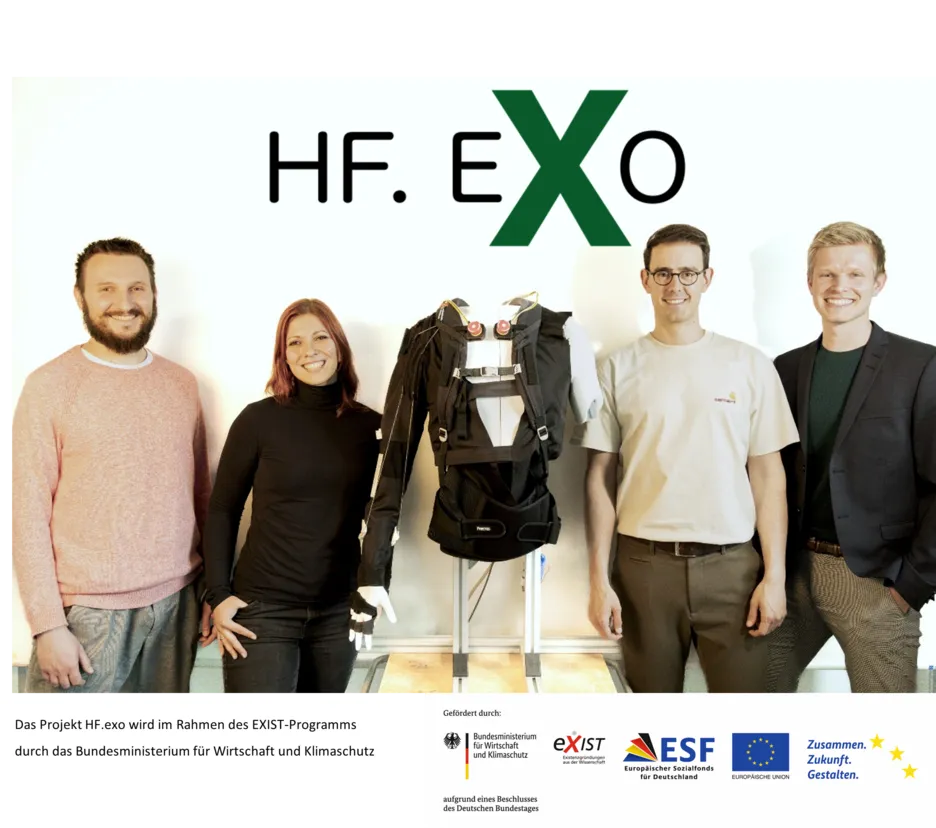 Since February 2024, the founding team has been working on the HF.exo project at the Chair of Ergonomics as part of an EXIST research transfer (funded by the BMWK on the basis of a decision of the German Bundestag and by the European Union - specifically by the European Social Fund Plus (ESF Plus)). The goal is to develop soft, active exoskeletons to support people in physically demanding jobs until they are ready for the field and to prepare a subsequent spin-off.