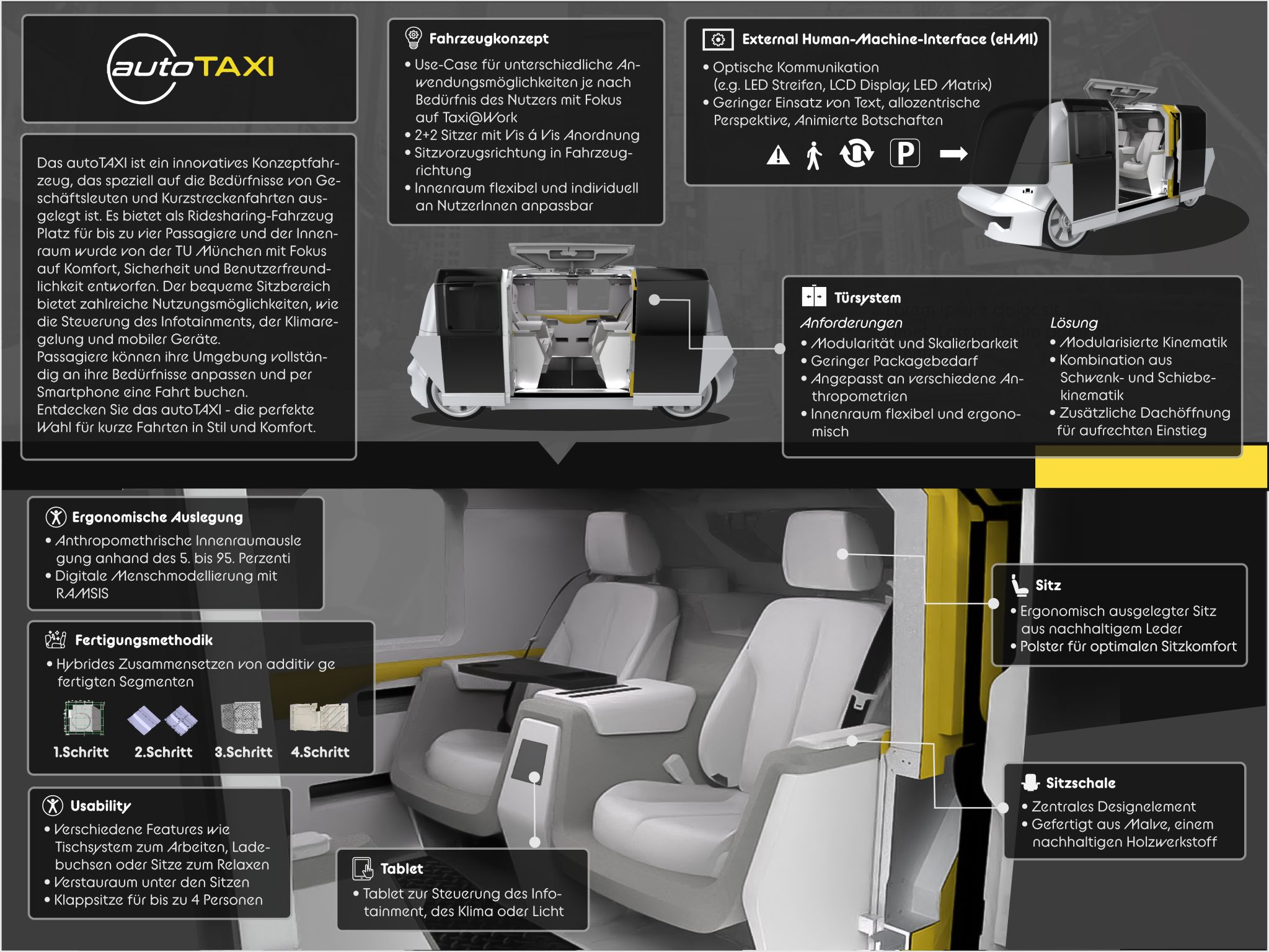 The project resulted in four innovative vehicle concepts: autoCARGO, autoELF, autoTAXI, and autoSHUTTLE. The Technical University of Munich, represented by the Chair of Ergonomics and FTM Institute of Automotive Technology TUM, focused on the development of the autoTAXI. The Chair of Ergonomics concentrated on human-machine interaction and ergonomic concept development, as well as the construction of the autoTAXI’s interior. The interior design was created by the Fachhochschule Salzburg - University of Applied Sciences, taking into account aspects of manufacturability, sustainability, and applicability. The Technical University of Munich used additive manufacturing methods to successfully translate the design into reality.