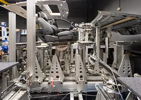 Developed and donated by the Daimler AG in 2013 the modular ergonomic mock up (short MEPS) is an automated multifunctional version of a seat mockup . Thus different vehicle geometries from sport-cars up to trucks, as well as tram wagon and new innovative concept of the interior (e.g. for highly automated driving) can be represented without big constructive input and in relatively short time. The flexibility is based on a modular construction of the mock up containing so called module wagons, which can be mobilized electrical, and a matching rail systems.