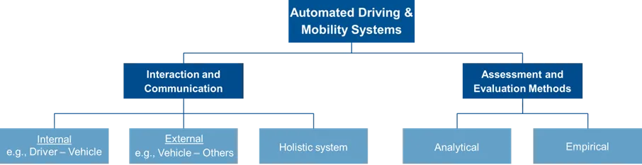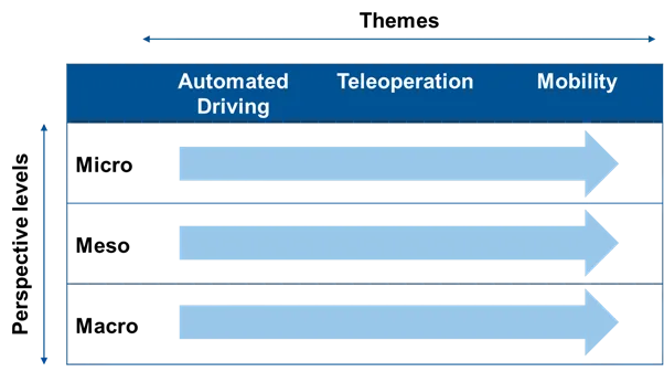In general, the research group focuses on three major topics: Automated Driving, Teleoperation and Mobility. These topics are investigated at different levels of perspective: from the micro level with local interactions, e.g. between driver and vehicle, to the macro level with more global interactions in the overall system.
