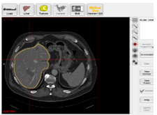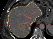 Lebertumore bzw. Metastasen lassen sich am Bildschirm meist gut erkennen und können mit wenigen Mausklicks angetastet werden. Pro Tumor ein Mausklick. Anschließend sind die Tumore auch in der 3D-Ansicht deutlich erkennbar.