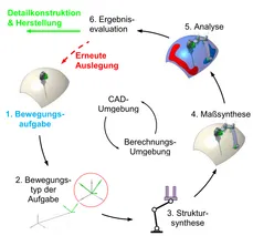 The basic idea of kinematic design is the development of optimal solutions with various degrees of freedom for arbitrary movement tasks. Computer-aided methods allow the design of mechanisms for versatile applications (e.g. automotive, assitive devices) and robot design.