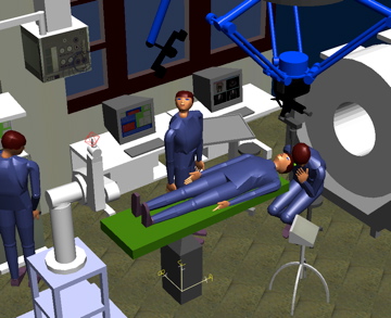 Results: We were able to show that using graphical simulation systems such as AnySYM/Robcad, it was possible to load image textures of current screen contents as well as medical image data into the graphical simulation in order to carry out a monitoring system for interventions in this way. In the period 1998-1999 the spectrum of applications was extended from MKG surgery to dentistry and prostate seed implantation (brachytherapy). Have in mind, that in 1999, the first onboard graphics cards for computers were shipped. We used at this time a silicon graphics machine for 100.000 DM for graphical visualization, that could be replaced by a Mac-Laptop with a comparable graphics power of 5% of the price of the SG machine a year later. The computer game “Far Cry” motivated us to introduce 3D surface models into surgical navigation and robotics.