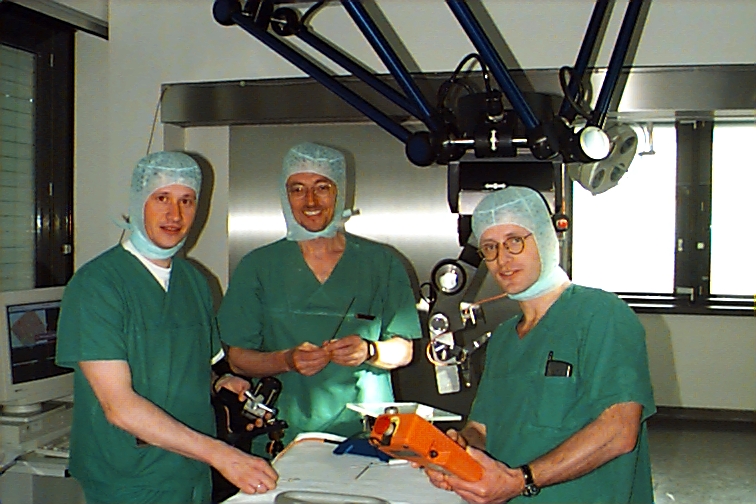 Background: Juergen Bier, chief maxillofacial surgeon at the Virchow Clinic Charité, and Joachim Mühling, chief maxillofacial surgeon at Heidelberg University Hospital, were both convinced as early as the early 1990s that robots and automation would find their way into the operating room. Both drove vintage car races and had a close connection to engineering. Juergen Bier's grandfather, August Bier, had already made outstanding contributions to surgery alongside Ferdinand Sauerbruch. While Joachim Mühling worked with Ulrich Rembold (University of Karlsruhe) from 1993 onwards to prepare SFB 414 (computer-assisted surgery, the successor to SFB 314), Jürgen Bier began working with Günter Hommel (Real-Time & Robotics, TU Berlin) in Berlin. In Karlsruhe, the KFZ was also home to the Artemis telemedicine project by Voges and Kühnapfel even before the founding of Intuitive Surgical. It was Günter Hommel who approached Tim Lueth (as a postdoctoral researcher with Ulrich Rembold) in 1996 during an assessment by the DFG in Bonn, asking him if he could imagine moving to Berlin and establishing personal contact with Jürgen Bier. Starting in the fall of 1996, Tim Lüth worked with Jürgen Bier to plan the staffing and equipment setup for a surgical robotics lab, while Jürgen Bier had the SurgiScope ceiling robot (microscope holder) installed in one of his operating rooms, at that time without MPG approval. After a proper appointment procedure and completing his habilitation examination in Karlsruhe, Tim Lüth was appointed professor at the Virchow Clinic, Charité, in 1997. It was the first professorship for clinical navigation and robotics, even before Russel Taylor's professorship at JHU, Baltimore, in 1998. Brian Davies in London was working in the field already.