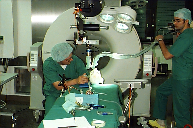 Results: In the period from early 1997 to late 1999, the ceiling-mounted delta kinematics of the SurgiScope were converted from a double joystick-controlled (submarine mode) microscope holder to a hands-on instrument-guiding robot. This involved the modification and extension of hardware components as well as a completely new real-time control, which included the active stereo camera (IGT Flashpoint 5000) in addition to the robot encoder. The robot was controlled by the surgeon's touch, whereby the robot receives a virtual mass and a virtual friction as well as virtual potential fields to precisely achieve an off-line programmed task (several implants) based on volumetric CT imaging and still give the physician the feeling of being able to move the robot freely. The controller was completed in 1999. The preparation of the approval documents for the TÜV in the period end of 1999 - beginning of 2000. The first clinical use took place in May 2000. The robot was operated in combination with a mobile intraoperative computer tomograph, TomoScan M from Philips, for 1 year regularly clinically. The doctors involved were Jürgen Bier, Martin Klein and Frank Hoelzle. The following projects investigated smaller robots (RoboDent), redundant robots (OTTO II, Mitsubishi PA-10) and Navigated Control® as a replacement for the large ceiling mounted robot. Malte Stien dealt with simulation and telemanipulation, Andreas Hein with real-time control of the hands-on robot and Jochen Albrecht (Queck) with intraoeprative tomographic imaging and automatic registration of CT and robot/navigation.