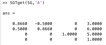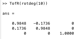 | % TofR(R,t) - returns a HT matrix for an R matrix % (by Tim Lueth, HT-Lib, 2016-JAN-06 as class: KINEMATICS AND FRAMES) % % Supports 2x2 and 3x3 rotation matrices. (Status of: 2017-01-29) % % See also: TofR, TofVL, TPL, TofDPhiH, T3ofT2, T3P, T2P, TofP, TofPez, % TofPEul % % T=TofR(R,[t]) % === INPUT PARAMETERS === % R: Rotation matrix 2x3 or 3x3 % t: optional translation vector (x y) or [x y z] % === OUTPUT RESULTS ====== % T: 3x3 or 4x4 transformation matrix % % EXAMPLE: Try: % TofR(rotdeg(30)) % TofR(rotdeg(30,40,30)) % TofR(rotdeg(30),[1 2]) % TofR(rotdeg(30,40,30),[1 2 3]) % |