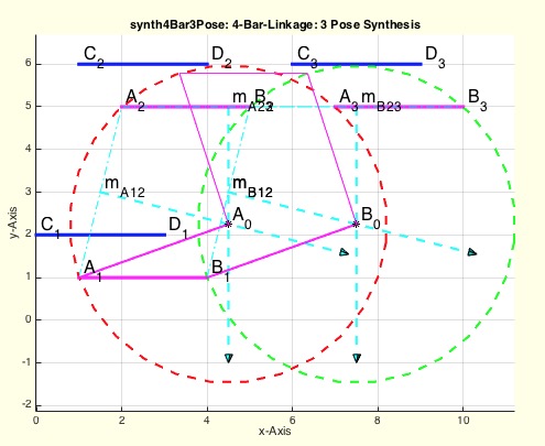 synth4Bar3Pose(C1,D1,C2,D2,C3,D3,d)- returns 4 points for a 4 Bar linkage |