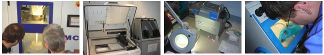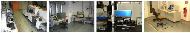 Picture description: a) Micro measurement devices, wafer saw. b) Sputtering, Anodic bonding, Wire bonding. c) Laser Nd-Yag Gator d) Scanning Electron Microscope (SEM)
