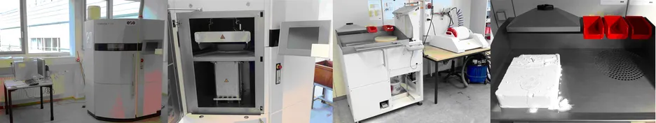 Picture description: a) EOS Formiga P100 selective lasersintering machine; b) Control unit and building inside the opened machine; c) Unpack / filtering and recycling station; d) Powder bed built parts in recycling station