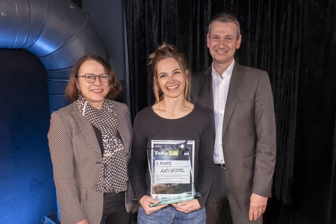 It's official - we have a winner! Our Kati was awarded first place at this year's FameLab Bavaria preliminary competition in Regensburg with her fascinating topic "I got your back"! With her extensive in-depth scientific knowledge and impressive entertainment value, Kati convinced the expert jury and won the coveted title.