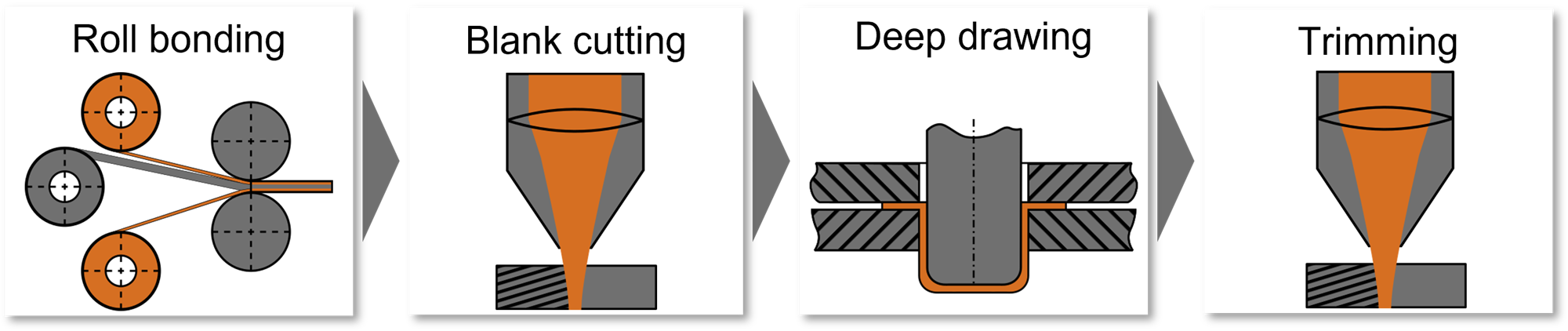 The object of the project is to investigate a 4-stage process chain for the production of a lightweight helmet made of an Al/Mg/Al sandwich structure with properties that can be specifically adjusted. The process chain consists of roll bonding, blank cutting, deep drawing and trimming. The properties that can be adjusted within technological limits are weight, rigidity, shape and dimensional accuracy, and the resulting CO2 footprint.