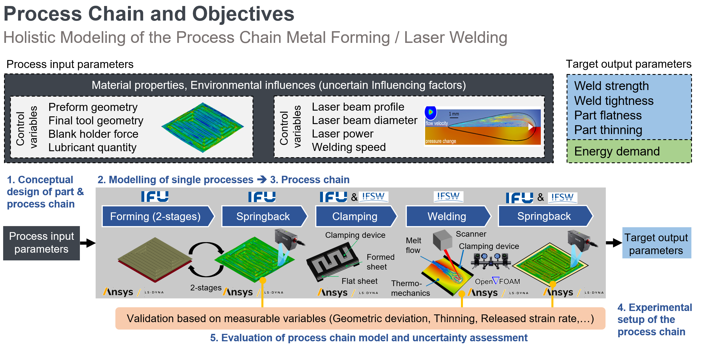 The goal of the project is the development of an integrated model of the forming/laser welding process chain that enables multi-criteria, quasi-inverse design. Deterministic input parameters such as tool geometry, friction conditions, laser power, and beam shaping will be considered, as well as uncertain parameters originating from material variability and environmental conditions. This will allow the identification of process parameters that ensure crack-free and dimensionally accurate components while minimizing energy consumption.