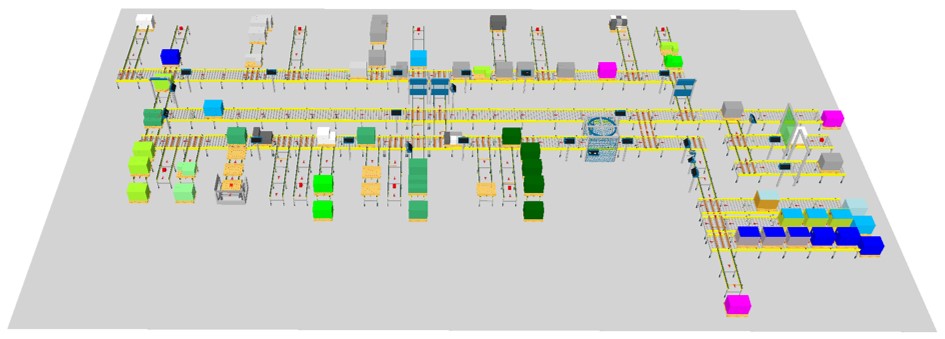 Diese häufig vorkommenden Module werden dann anhand des generischen Steuerungsalgorithmus ausgearbeitet, woraus sich eine Basis-Bibliothek für automatisierte Materialflusssysteme ergibt. Mit den Modulen dieser Bibliothek kann die Steuerungssoftware für die typischen Strukturen von Materialflusssystemen umgesetzt werden, und zusätzlich ist durch den generischen Steuerungsalgorithmus gewährleistet, dass diese Bibliothek um projektspezifische Module erweitert werden kann. Die Funktionstüchtigkeit des entwickelten modularen Konzepts der Steuerungssoftware wird dann anhand eines umfangreichen industriellen Layouts der Palettenfördertechnik in einer Emulationsumgebung aufgezeigt (siehe Abbildung 4).