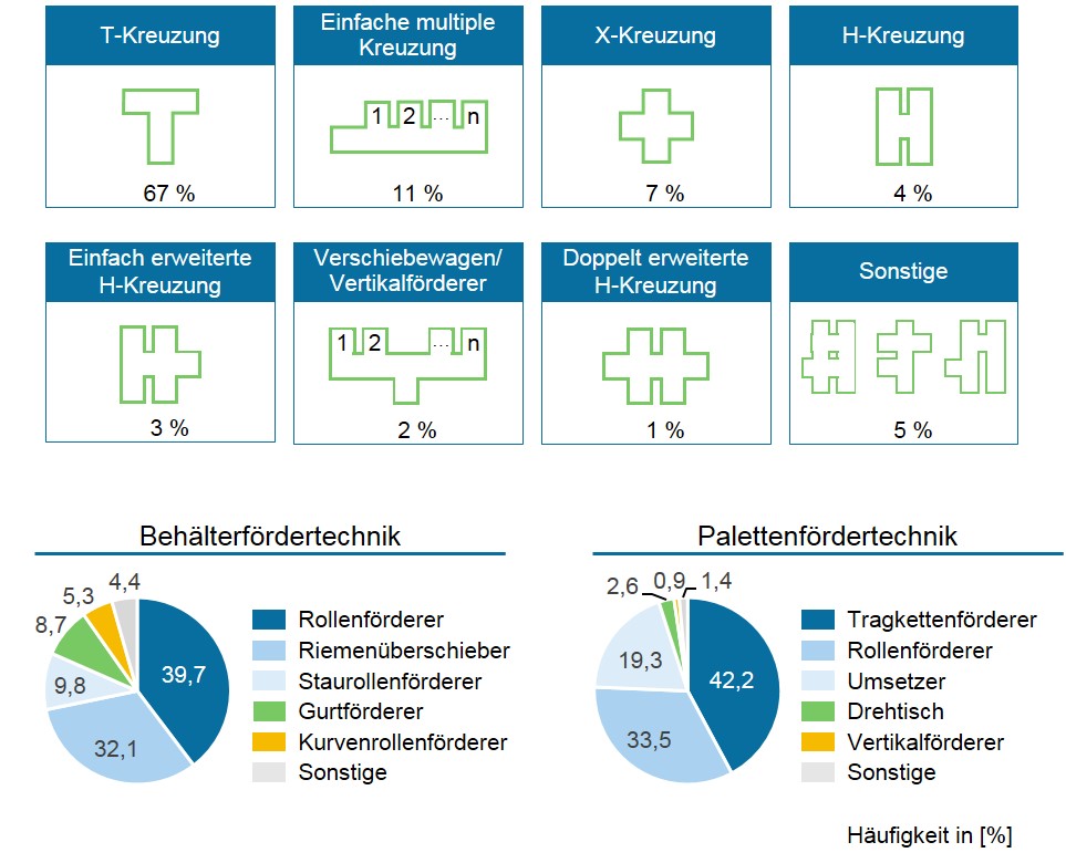 Anschließend wird anhand von Layouts analysiert, welche Fördertechnik-Module und Logistik-Module am häufigsten in automatisierten Materialflusssystemen verwendet werden. Das Ergebnis dieser Analyse ist, dass mit sieben Kreuzungstypen 95 % der Kreuzungen abgedeckt werden und lediglich 5 % der Kreuzungen individuelle Kreuzungen sind (siehe Abbildung 3). Hinsichtlich der Fördertechnik-Module ergibt sich ein ähnliches Bild: Mit 5 Arten von Fördermitteln sind bei der Behälterfördertechnik 95,4 % der Fördermittel und bei der Palettenfördertechnik 98,5 % der Fördermittel abgedeckt (siehe Abbildung 4). Darüber hinaus ergab sich, dass die häufigsten Handhabungsgeräte Konturenkontrolle (42 %), Waage (17 %), automatisierte Magazine für Paletten sowie Behälter (16 %) und Kufen- und Fußfreiraumkontrolle (12 %) sind. Die restlichen 13 % der Handhabungsgeräte verteilen sich auf sonstige Geräte, z. B. Belegbeigeber, Etikettierer oder Palettenwickler.