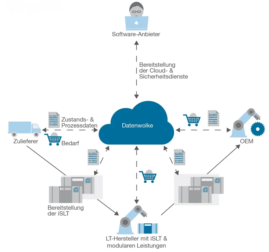 Zielsetzung des Verbundprojekts iSLT.NET ist es daher diese Problemstellungen aufzugreifen, ein Netzwerk aus intelligenten, modularen SLT zu konzipieren und dieses in einer Supply-Chain mithilfe eines neuartigen Geschäftsmodells zu realisieren. Als einer der ersten Schritte soll dabei ein standardisiertes Baukastensystem für SLT entstehen, welches eine branchenweite Rekonfiguration und Wiederverwendung der Baukastenmodule ermöglicht. Teil dieses Baukastensystems soll auch die integrierbare IoT-Technologie (Internet of Things) sein, welche das dezentrale Sammeln und Abrufen von Daten ermöglichen soll und dem SLT Intelligenz verleiht. Die Identifikation prozessrelevanter Daten im Kontext des Ladungsträgermanagements (z. B. Ort, Beladungszustand, Temperatur, Erschütterung, Defekte) soll in einem weiteren Arbeitspaket behandelt werden. Um eine unternehmensübergreifende Nutzung dieser Daten zu ermöglichen, soll eine Cloud Plattform mit entsprechenden Software Services entstehen. Diese sollen auf Basis der erfassten Daten neue Funktionen für die Beteiligten bereitstellen und somit einen Mehrwert für die gesamte Supply Chain generieren.