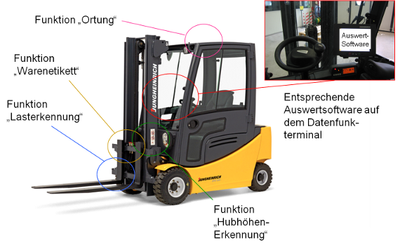 Die Kontrolle der intralogistischen Prozesse durch integrierte IT-Systeme nimmt einen immer höheren Stellenwert ein. Im klassischen Betrieb werden die notwendigen Daten für die IT-Überwachung mittels Barcodescanner manuell erhoben. In der Vergangenheit kamen bereits Teilautomatisierungen durch RFID Systeme auf, welche Ladungsträger, Waren und Lagerfächer erkennen. Zusätzlich notwendige Daten, wie z.B. die Hubhöhe des Flurförderzeugs oder das Auslösen eines Lesevorgangs durch Lasterkennung werden mittels separater externer Sensorik erhoben.
