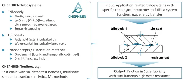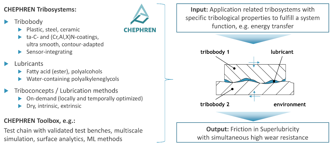 Aufgrund des Klimawandels und begrenzter Ressourcen rückt die Energie- und Ressourceneffizienz von Maschinen und Anlagen zunehmend in den Vordergrund. Ziel des Verbundvorhabens CHEPHREN ist die Reduzierung von Reibung durch Supraschmierung („Superlubricity“) in Maschinenelementen. Im CHEPHREN Forschungsvorhaben beschäftigt sich die Forschungsstelle für Zahnräder und Getriebesysteme (FZG) vordergründig mit der Reduzierung der Energiedissipation in Getrieben durch bedarfsangepasste Tribosysteme. Neben der grundlagenorientieren Forschung auf tribologischer Kontaktebene erfolgt der systematische Transfer der Erkenntnisse auf Anwendungen wie beispielsweise Verzahnungen. Dabei wird insbesondere an folgenden Arbeitsfeldern geforscht: