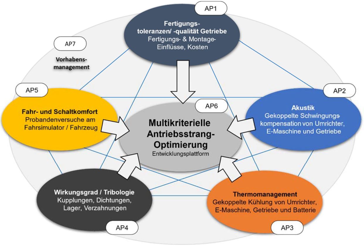 Trotz der verhältnismäßig langen Entwicklungszeit zur Konzeption, Auslegung und Konstruktion erfüllen die Antriebsstränge aktueller EVs bei weitem noch nicht alle Entwicklungsziele. Zwar sind für die einzelnen Komponenten des Antriebsstrangs (wie Leistungselektronik, E-Maschinen, Getriebe) leistungsfähige Methoden und Werkzeuge zur Entwicklung verfügbar, zur Abstimmung und Optimierung des gesamten Antriebssystems sind jedoch derzeit weder entsprechende öffentlich bekannte Methoden noch Werkzeuge vorhanden. Speziell die Einflüsse und gegenseitigen Beeinflussungen von Fertigungstoleranzen, NVH-Verhalten, Thermomanagement und Fahrbarkeit im Zusammenspiel mit Wirkungsgrad/Tribologie und Betriebsstrategie sind sehr komplex. Die gegenseitige Beeinflussung der zahlreichen Optimierungskriterien sind oft schwer zu modellieren und sind teils widersprüchlich. Je nach Gewichtungsfunktion und Anwendungsprofil können somit sehr viele verschiedene Antriebe für eine Zielerreichung entstehen.