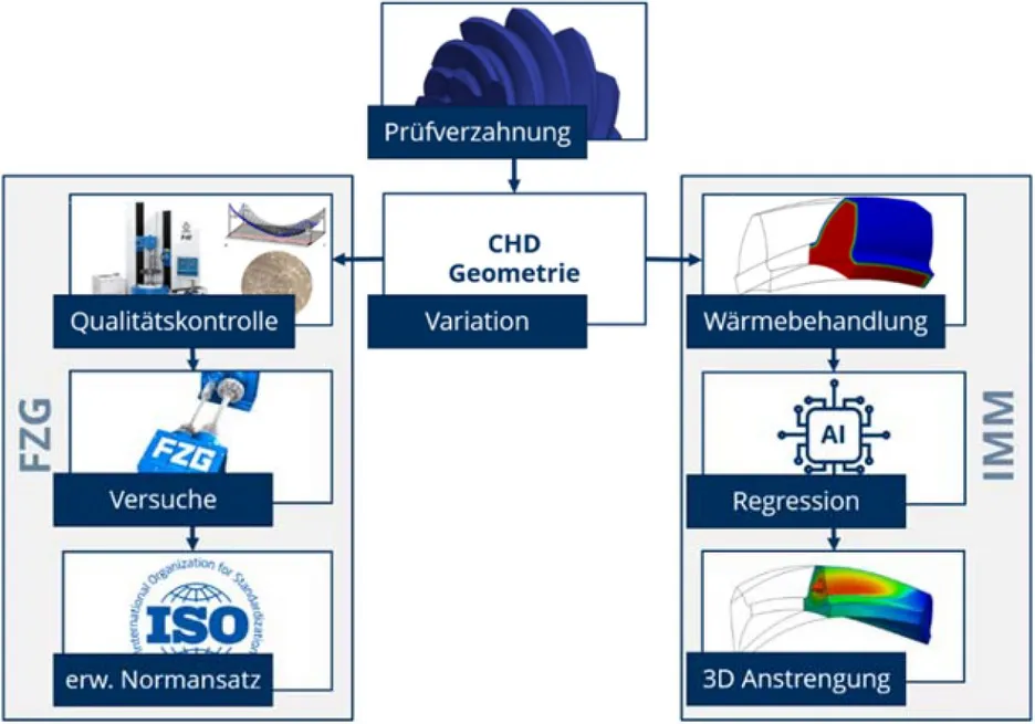 Um das zu erarbeitende Konzept auf soliden Ergebnissen aufzubauen, ist eine umfassende experimentelle und simulative Untersuchung des Schadens Zahnflankenbruch vorgesehen. Das Vorhaben soll durch Versuche an der FZG der TU München begleitet werden. Die wissenschaftlich-technische Herausforderung liegt in der computergestützten Nachmodellierung der experimentellen Untersuchungen, welche metallographische Untersuchungen und Topographievermessungen am Zahnrad und Versuchsläufe am FZG-KegelradVerspannungsprüfstand beinhalten. Mit diesem Projekt soll ein Meilenstein gesetzt werden, um weitere Werkstoffe, Wärmebehandlungen und Verzahnungsgeometrien systematisch hinsichtlich Ihres Einflusses auf die Schadensart Flankenbruch hin untersuchen zu können. Somit wird es zukünftig möglich sein, ein breit gefächertes Spektrum an Verzahnungsvariationen bezüglich Flankenbruch zu berechnen.