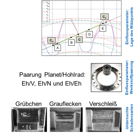 Innenverzahnungen bieten, im Gegensatz zu Außenverzahnungen, die Möglichkeit den Wälzpunkt C außerhalb der Eingriffsstrecke der Verzahnung zu legen. Damit können, je nach Auslegung, entweder am Planeten oder am Hohlrad negatives spezifisches Gleiten vollständig vermieden bzw. die Beträge des negativen spezifischen Gleitens deutlich reduziert werden. Dadurch besteht die Möglichkeit, die Grauflecken-, Grübchen- und Verschleißtragfähigkeit von Innenverzahnungen gezielt zu beeinflussen. Ergebnisse systematischer Untersuchungen zu diesen Einflussgrößen liegen bisher allerdings nicht vor. Die Tragfähigkeitsreserven der Werkstoffe im Bereich positiven spezifischen Gleitens sind nicht quantifiziert und existierende Berechnungsverfahren zur Flankentragfähigkeit sind für Verzahnungen mit einem außerhalb der Eingriffsstrecke liegenden Wälzpunkt nicht verifiziert.
