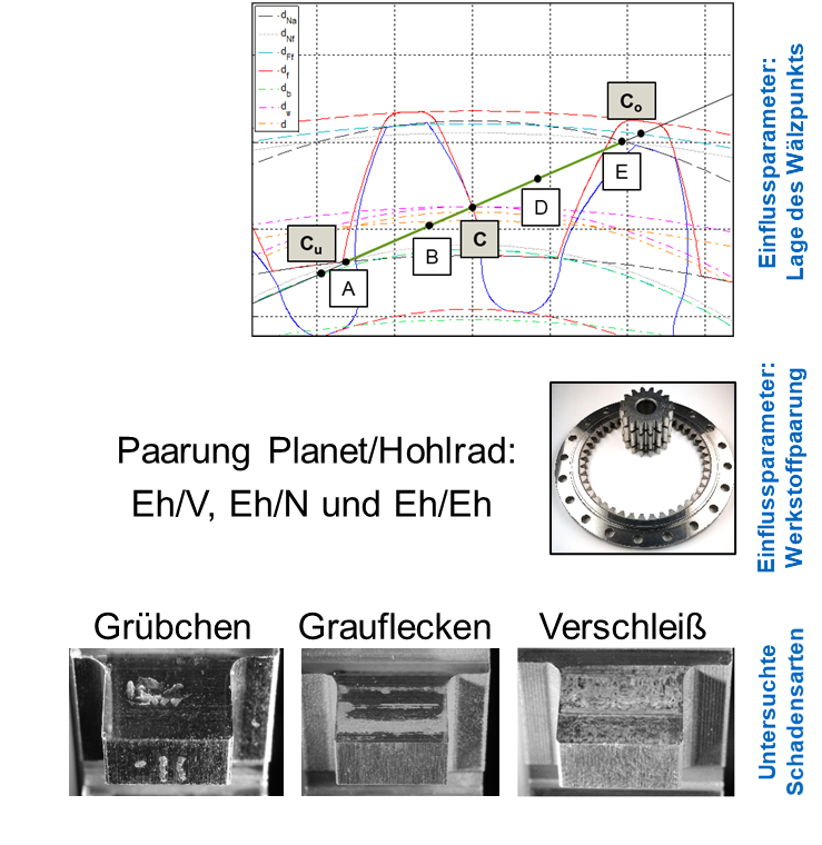 Innenverzahnungen bieten, im Gegensatz zu Außenverzahnungen, die Möglichkeit den Wälzpunkt C außerhalb der Eingriffsstrecke der Verzahnung zu legen. Damit können, je nach Auslegung, entweder am Planeten oder am Hohlrad negatives spezifisches Gleiten vollständig vermieden bzw. die Beträge des negativen spezifischen Gleitens deutlich reduziert werden. Dadurch besteht die Möglichkeit, die Grauflecken-, Grübchen- und Verschleißtragfähigkeit von Innenverzahnungen gezielt zu beeinflussen. Ergebnisse systematischer Untersuchungen zu diesen Einflussgrößen liegen bisher allerdings nicht vor. Die Tragfähigkeitsreserven der Werkstoffe im Bereich positiven spezifischen Gleitens sind nicht quantifiziert und existierende Berechnungsverfahren zur Flankentragfähigkeit sind für Verzahnungen mit einem außerhalb der Eingriffsstrecke liegenden Wälzpunkt nicht verifiziert.