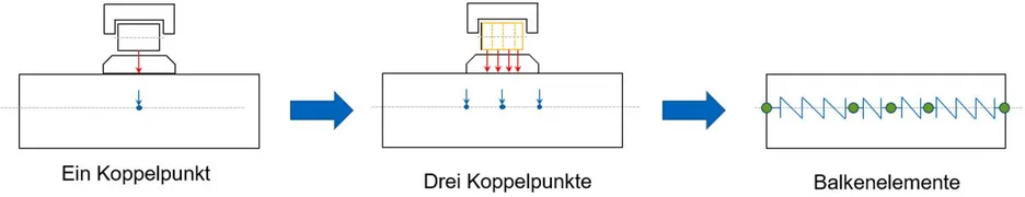 In Abbildung 1 ist schematisch dargestellt, wie die Anzahl der Breitenstützpunkte vergrößert wird. Zudem ist zu erkennen, dass sich die Breitenstützpunkte in äquidistanten Abständen über die gesamte Lagerbreite verteilen. So wird der erste Breitenstützpunkt am Lageranfang positioniert, der zweite in der Mitte des Lagers und der dritte am Lagerende. Die Vergrößerung Breitenstützpunkte hat aus wesentlichem Einfluss auf die Anzahl der Balkenelemente, anhand derer eine Welle in RIKOR Modelliert wird.
