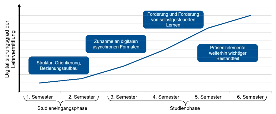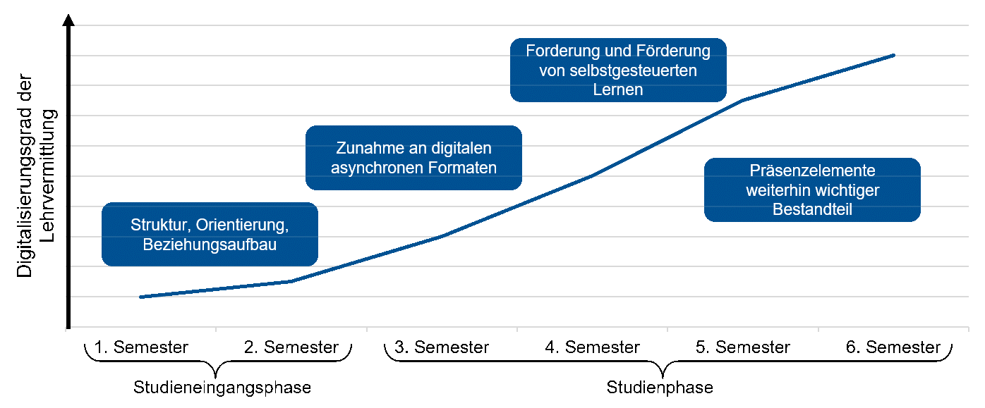 Das Projekt „Kompetenz- und Bedarfsoptimierte Lehrstrategie“ soll für die Studieneingangs- und Studiumsphase eine kriterienbasierte Leitlinie für analoge, digitale sowie synchrone bzw. asynchrone Lehransätze und –formate bieten. Die Strategie richtet den Digitalisierungsgrad der Lehrvermittlung an den Bedürfnissen und den zu erwerbenden Kompetenzen der Studierenden aus. Die jeweiligen Vorteile der Lehransätze und -formate sollen bestmöglich in den verschiedenen Phasen des Studiums eingesetzt werden. Anfangs werden die Studierenden durch einen hohen Anteil an Präsenzveranstaltungen in ihren neuen Lebensabschnitt eingeführt und schrittweise an digitale, asynchrone Formate herangeführt. Digitale Angebote sollen punktuell unterstützen und vorrangig eingesetzt werden, wenn die zu erwerbenden Kompetenzen z. B. den Umgang mit Software bedürfen. Im weiteren Verlauf nimmt der Anteil an digital asynchronen Formaten zu, um ein selbstgesteuertes Lernen der Studierenden zu fordern und zu fördern. Abbildung 1 stellt den Digitalisierungsgrad der Lehrvermittlung über den Verlauf des Studiums schematisch dar und ordnet den einzelnen Phasen, Studieneingangs- und Studienphase, Schwerpunkte des Konzepts zu.